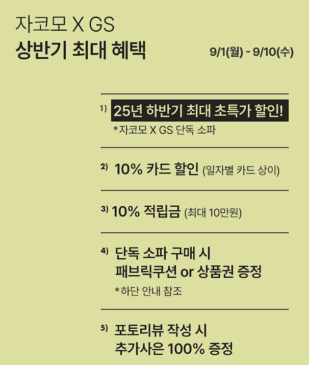 자코모 25년 하반기 최대 할인 이벤트 자코모 25년 하반기 최대 할인 이벤트 정보 포스팅입니다. 자코모 다양한 제품을 할인 판매하네요. 할인 품목 : 소파 이벤트 기간 : 2025년 9월 10일까지 자코모 25년 하반기 최대 할인 이벤트 정보 [링크] 핫딜/식품&생활 2025.09.09