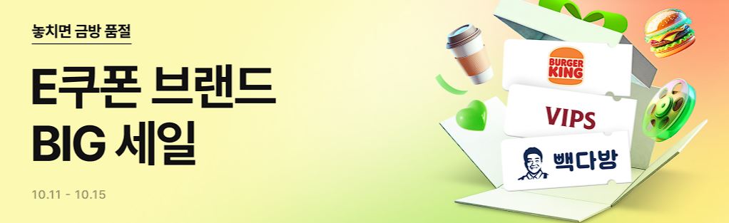11번가 E쿠폰 브랜드 빅 세일 11번가 E쿠폰 브랜드 빅 세일 정보 포스팅입니다. 11번가 다양한 E쿠폰을 할인 판매하네요. 할인 브랜드 : BBQ, 롯데시네마 등 이벤트 기간 : 2025년 10월 15일까지 11번가 E쿠폰 브랜드 빅 세일 정보 [링크] 핫딜/식품&생활 2025.10.15