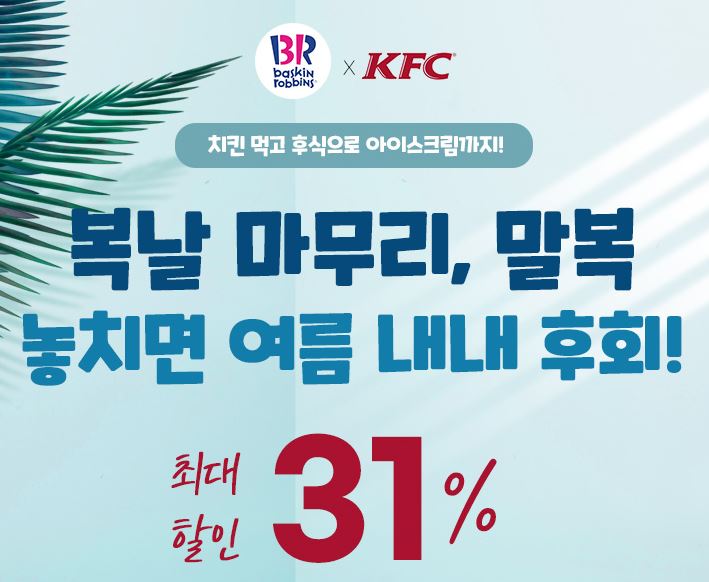 배스킨라빈스xKFC 최대 31% 할인 배스킨라빈스xKFC 최대 31% 할인 정보 포스팅입니다. 다양한 메뉴를 할인 판매하네요. 할인 품목 : 말복순살팩+쿼터, 말복버거팩+패밀리 등 배스킨라빈스xKFC 최대 31% 할인 정보 [링크] 핫딜/식품&생활 2022.08.10