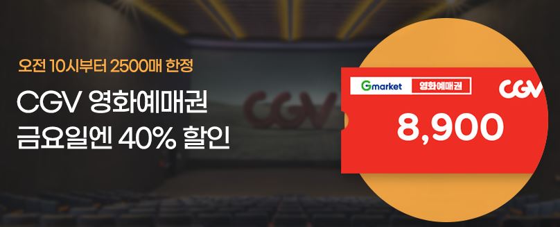 CGV 영화예매권 40% 할인 CGV 영화예매권 40% 할인 정보 포스팅입니다. CGV 영화예매권을 할인 판매하네요. 할인가 8900원 오전 10시 선착순 판매 G마켓 [링크] 옥션 [링크] 핫딜/식품&생활 2022.08.05