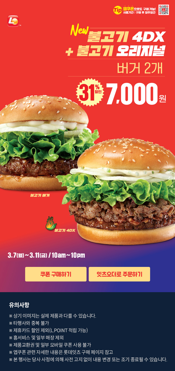 롯데리아 31% 할인 롯데리아 31% 할인 정보 포스팅입니다. 롯데리아 할인 이벤트를 진행하네요. 할인 메뉴 : 불고기 4DX, 불고기 오리지널 가격 7000원 이벤트 기간 : 2022년 3월 7일 ~ 2022년 3월 11일 핫딜/식품&생활 2022.03.07