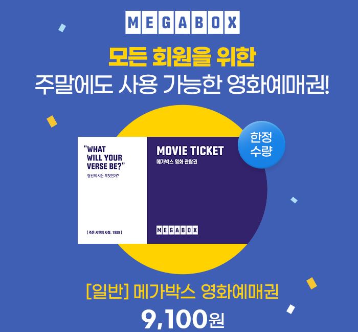 메가박스 영화예매권 할인 메가박스 영화예매권 할인 정보 포스팅입니다. 메가박스 영화예매권을 할인 판매하네요. 정가 12000원 / 할인가 9100원 메가박스 영화예매권 할인 정보 [링크] 핫딜/식품&생활 2022.06.22