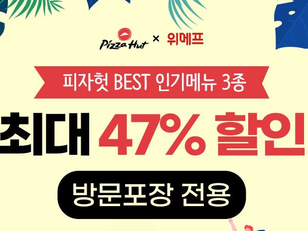 피자헛 방문포장 최대 47% 할인 피자헛 방문포장 최대 47% 할인 정보 포스팅입니다. 피자헛 다양한 메뉴를 할인 판매하네요. 할인 메뉴 : 마니아 웨지포테이토L+콜라 1.25L 등 피자헛 방문포장 최대 47% 할인 정보 [링크] 핫딜/식품&생활 2022.06.23