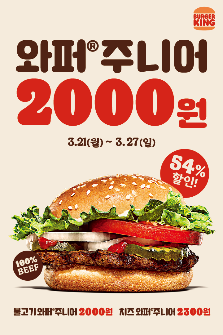 버거킹 최대 54% 할인 버거킹 최대 54% 할인 정보 포스팅입니다. 버거킹 다양한 메뉴를 할인 판매하네요. 할인 메뉴 : 와퍼주니어, 치즈와퍼주니어, 불고기와퍼주니어 이벤트 기간 : 2022년 3월 21일 ~ 2022년 3월 27일 핫딜/식품&생활 2022.03.21