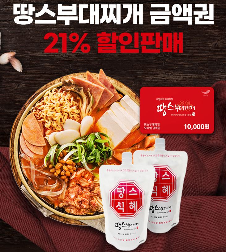 땅스부대찌개 1만원권 21% 할인 땅스부대찌개 1만원권 21% 할인 정보 포스팅입니다. 땅스부대찌개 1만원권을 할인 판매하네요. 정가 1만원 / 할인가 7900원 땅스부대찌개 1만원권 21% 할인 정보 [링크] 핫딜/식품&생활 2021.06.17