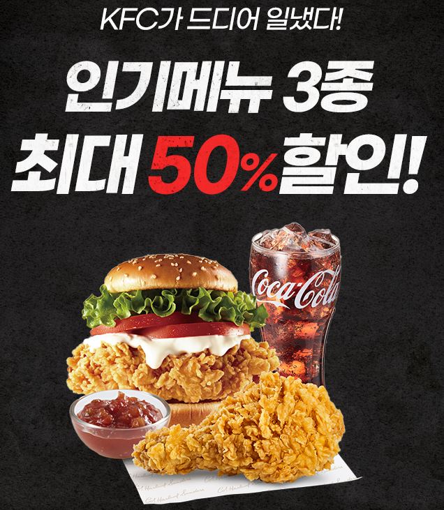 KFC 인기메뉴 3종 최대 50% 할인 KFC 인기메뉴 3종 최대 50% 할인 정보 포스팅입니다. KFC 다양한 메뉴를 할인 판매하네요. 할인 메뉴 : 징거치킨세트, 베스트트윈팩 등 KFC 인기메뉴 3종 최대 50% 할인 정보 [링크] 핫딜/식품&생활 2021.10.05
