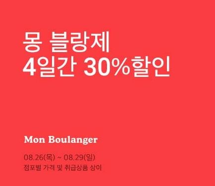 몽 블랑제 30% 할인 몽 블랑제 30% 할인 정보 포스팅입니다. 몽 블랑제 다양한 제품을 할인 판매하네요. 할인 품목 : 롤케이크, 식빵, 모카번, 마카롱 등 이벤트 기간 : 2021년 8월 29일까지 몽 블랑제 30% 할인 정보 [링크] 핫딜/식품&생활 2021.08.27