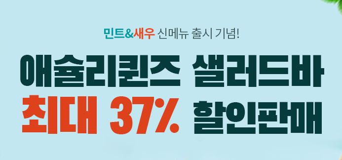 애슐리퀸즈 샐러드바 최대 37% 할인 애슐리퀸즈 샐러드바 최대 37% 할인 정보 포스팅입니다. 애슐리퀸즈 다양한 메뉴를 할인 판매하네요. 할인 메뉴 : 디너 1+1 세트, 디너 2+1 세트 등 애슐리퀸즈 샐러드바 최대 37% 할인 정보 [링크] 핫딜/식품&생활 2021.07.07