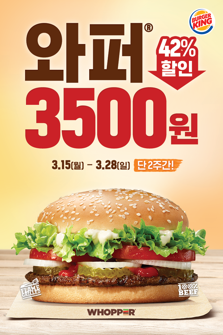버거킹 와퍼 42% 할인 버거킹 와퍼 42% 할인 정보 포스팅입니다. 버거킹 와퍼 할인 이벤트르 진행하네요. 할인가 3500원 이벤트 기간 : 2021년 3월 15일 ~ 3월 28일 핫딜/식품&생활 2021.03.15