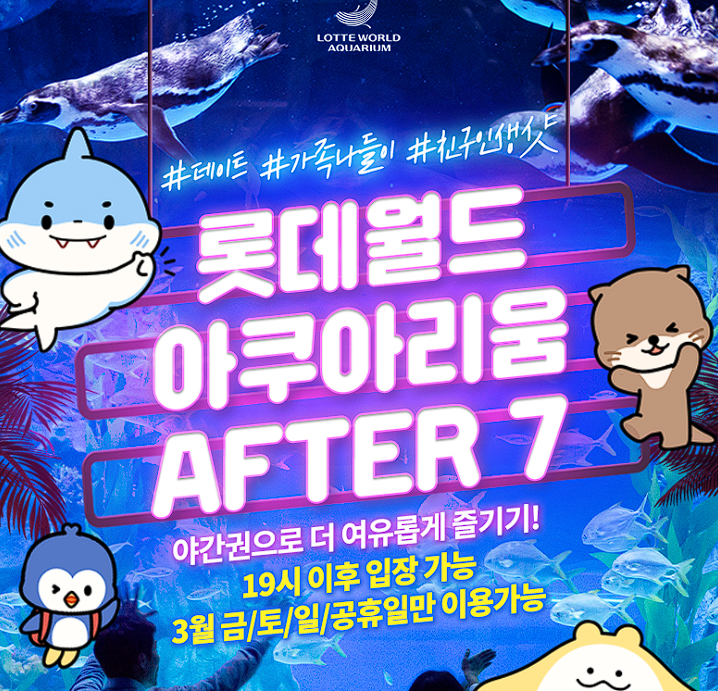 잠실 롯데월드 아쿠아리움 AFTER 7 입장권 할인 잠실 롯데월드 아쿠아리움 AFTER 7 입장권 할인 정보 포스팅입니다. 잠실 롯데월드 아쿠아리움 AFTER 7 입장권 할인 판매하네요. 할인가 17000원 이벤트 기간 : 2025년 3월 31일까지 (오후 7시 이후 입장, 금토일 공휴일만 가능) 잠실 롯데월드 아쿠아리움 AFTER 7 입장권 할인 정보 [링크] 핫딜/식품&생활 2025.03.21