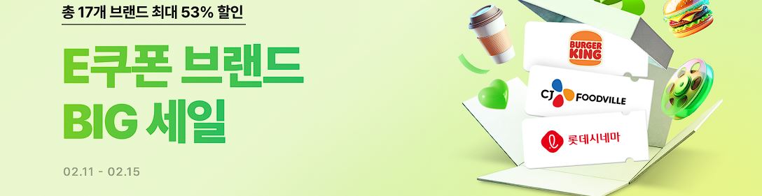 11번가 E쿠폰 브랜드 빅 세일 11번가 E쿠폰 브랜드 빅 세일 정보 포스팅입니다. 11번가 다양한 E쿠폰을 할인 판매하네요. 할인 브랜드 : 멕시카나, 롯데시네마, 피자헛 등 이벤트 기간 : 2025년 2월 11일 ~ 2025년 2월 15일 11번가 E쿠폰 브랜드 빅 세일 정보 [링크] 핫딜/식품&생활 2025.02.11