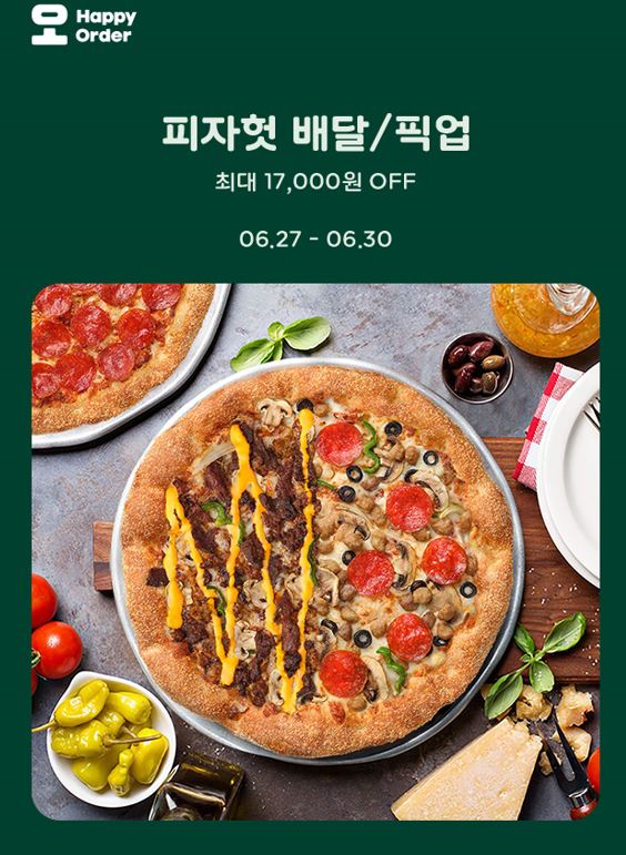 해피오더 피자헛 배달 / 픽업 최대 17000원 할인 해피오더 피자헛 배달 / 픽업 최대 17000원 할인 정보 포스팅입니다. 해피오더 앱에서 피자헛 할인 이벤트를 진행하네요. 24000원 이상 픽업 주문시 17000원 할인 22000원 이상 배달 주문시 7000원 할인 이벤트 기간 : 2024년 6월 30일까지 핫딜/식품&생활 2024.06.30