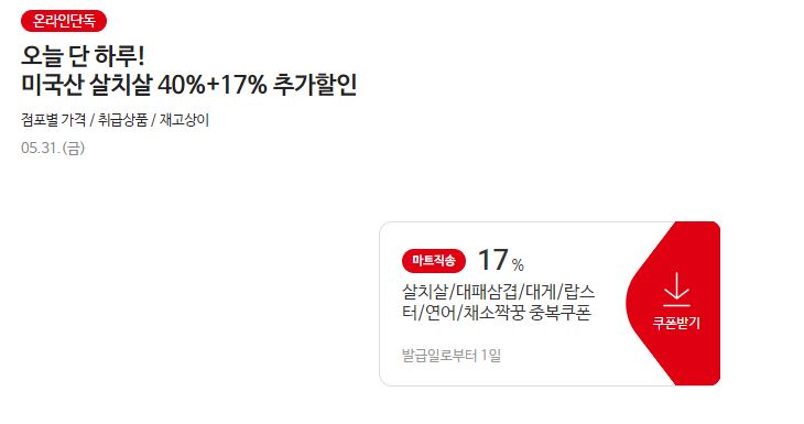 홈플러스 미트프라이데이 이벤트 홈플러스 미트프라이데이 이벤트 정보 포스팅입니다. 홈플러스 다양한 제품을 할인 판매하네요. 할인 품목 : 살치살, 갈비살, 안심 등 이벤트 기간 : 2024년 5월 31일 홈플러스 미트프라이데이 이벤트 정보 [링크] 핫딜/식품&생활 2024.05.31