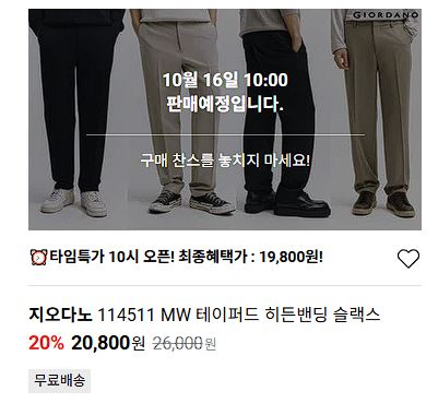 지오다노 테이퍼드 히든밴딩 슬랙스 타임 특가 할인 지오다노 테이퍼드 히든밴딩 슬랙스 타임 특가 할인 정보 포스팅입니다. 지오다노 테이퍼드 히든밴딩 슬랙스 할인 판매하네요. 할인가 18760원 무료배송 지오다노 테이퍼드 히든밴딩 슬랙스 타임 특가 할인 정보 [링크] 핫딜/패션&스포츠 2025.10.16