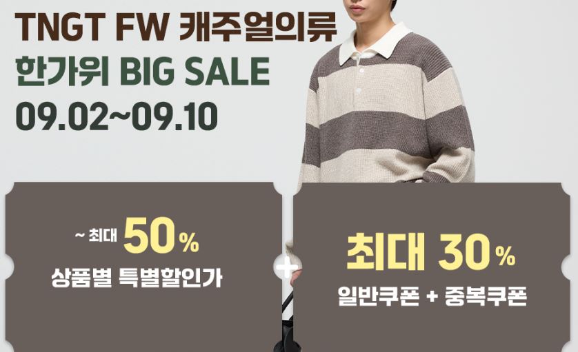 TNGT FW 최대 50% 세일 TNGT FW 최대 50% 세일 정보 포스팅입니다. TNGT 다양한 제품을 할인 판매하네요. 할인 품목 : 후드티, 맨투맨, 자켓 등 이벤트 기간 : 2024년 9월 10일까지 무료배송 TNGT FW 최대 50% 세일 정보 [링크] 핫딜/패션&스포츠 2024.09.05