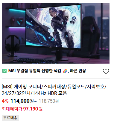 MSI 할인 이벤트 MSI 할인 이벤트 정보 포스팅입니다. MSI 다양한 제품을 할인 판매하네요. 할인 품목 : 모니터, 거치대 등 무료배송 MSI 할인 이벤트 정보 [링크] 핫딜/PC&가전 2026.04.15