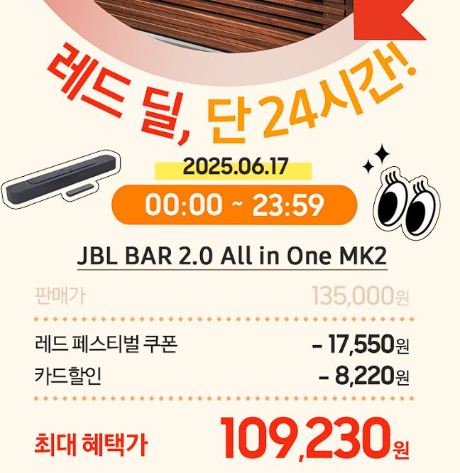 JBL BAR 2.0 All in One MK2 사운드바 할인 JBL BAR 2.0 All in One MK2 사운드바 할인 정보 포스팅입니다. JBL BAR 2.0 All in One MK2 사운드바 할인 판매하네요. 할인가 109230원 무료배송 할인 기간 : 2025년 6월 17일 JBL BAR 2.0 All in One MK2 사운드바 할인 정보 [링크] 핫딜/PC&가전 2025.06.17