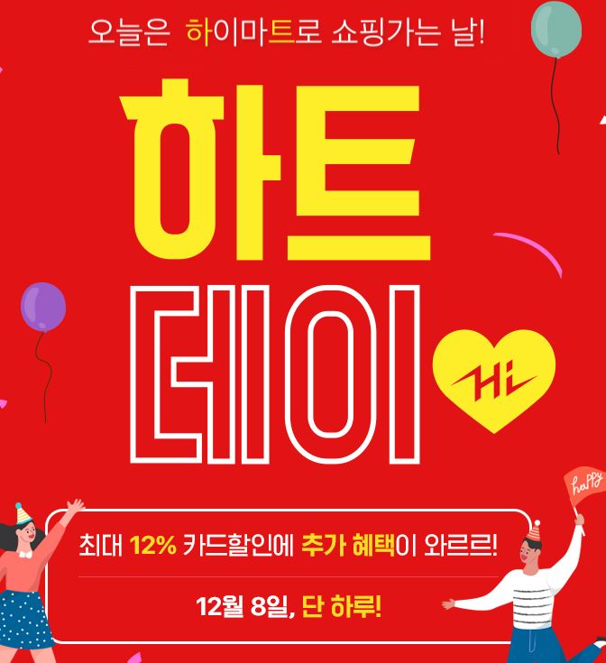 하이마트 하트데이 이벤트 하이마트 하트데이 이벤트 정보 포스팅입니다. 하이마트 사이트에서 할인 이벤트를 진행하네요. 할인 품목 : 노트북, 휴대폰, 티비 등 이벤트 기간 : 2021년 12월 8일 하이마트 하트데이 이벤트 정보 [링크] 핫딜/PC&가전 2021.12.08