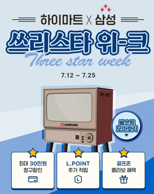 삼성 쓰리스타 위크 이벤트 삼성 쓰리스타 위크 이벤트 정보 포스팅입니다. 삼성 다양한 제품을 할인 판매하네요. 할인 품목 : 노트북, 휴대폰, 모니터 등 이벤트 기간 : 2021년 7월 25일까지 삼성 쓰리스타 위크 이벤트 정보 [링크] 핫딜/PC&가전 2021.07.13