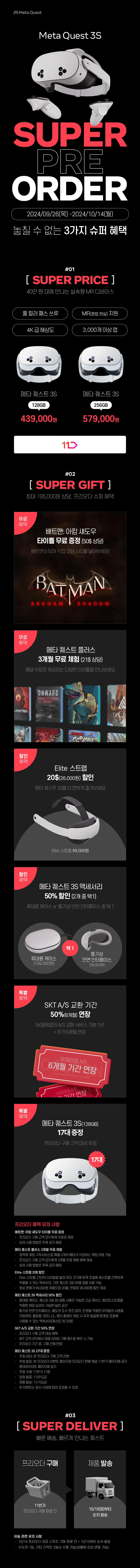 메타퀘스트3S 사전 예약 이벤트 메타퀘스트3S 사전 예약 이벤트 정보 포스팅입니다. 메타퀘스트3S 사전 예약 이벤트를 진행하네요. 프리오더 혜택 : 배트맨 아캄 섀도우 증정, 엘리트 스트랩 할인 등 메타 퀘스트 3S 125GB 가격 439000원 메타 퀘스트 3S 256GB 가격 579000원 이벤트 기간 : 2024년 9월 26일 ~ 2024년 10월 14일 메타퀘스트3S 사전 예약 이벤트 정보 [링크] 핫딜/PC&가전 2024.09.26