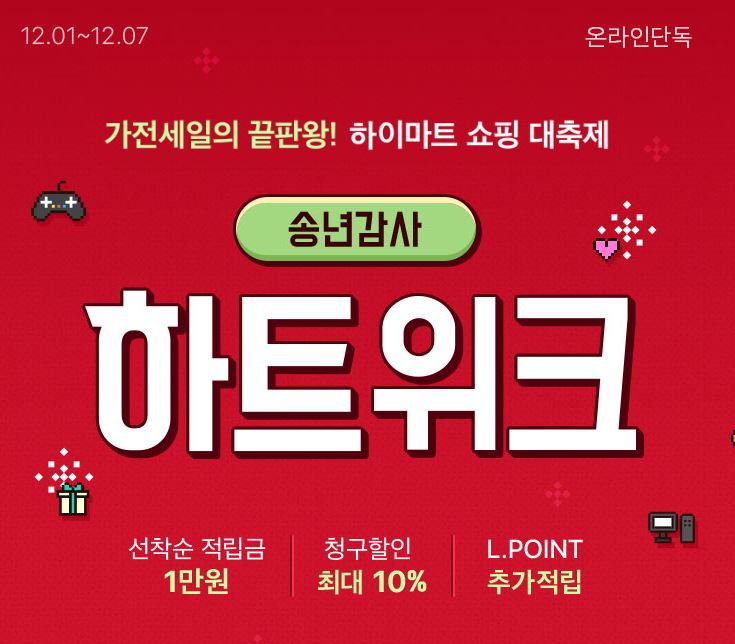 하이마트 송년감사 하트위크 이벤트 하이마트 송년감사 하트위크 이벤트 정보 포스팅입니다. 하이마트 사이트에서 할인 이벤트를 진행하네요. 할인 품목 : 휴대폰, 모니터, 노트북 등 이벤트 기간 : 2022년 12월 1일 ~ 2022년 12월 7일 하이마트 송년감사 하트위크 이벤트 정보 [링크] 핫딜/PC&가전 2022.12.01