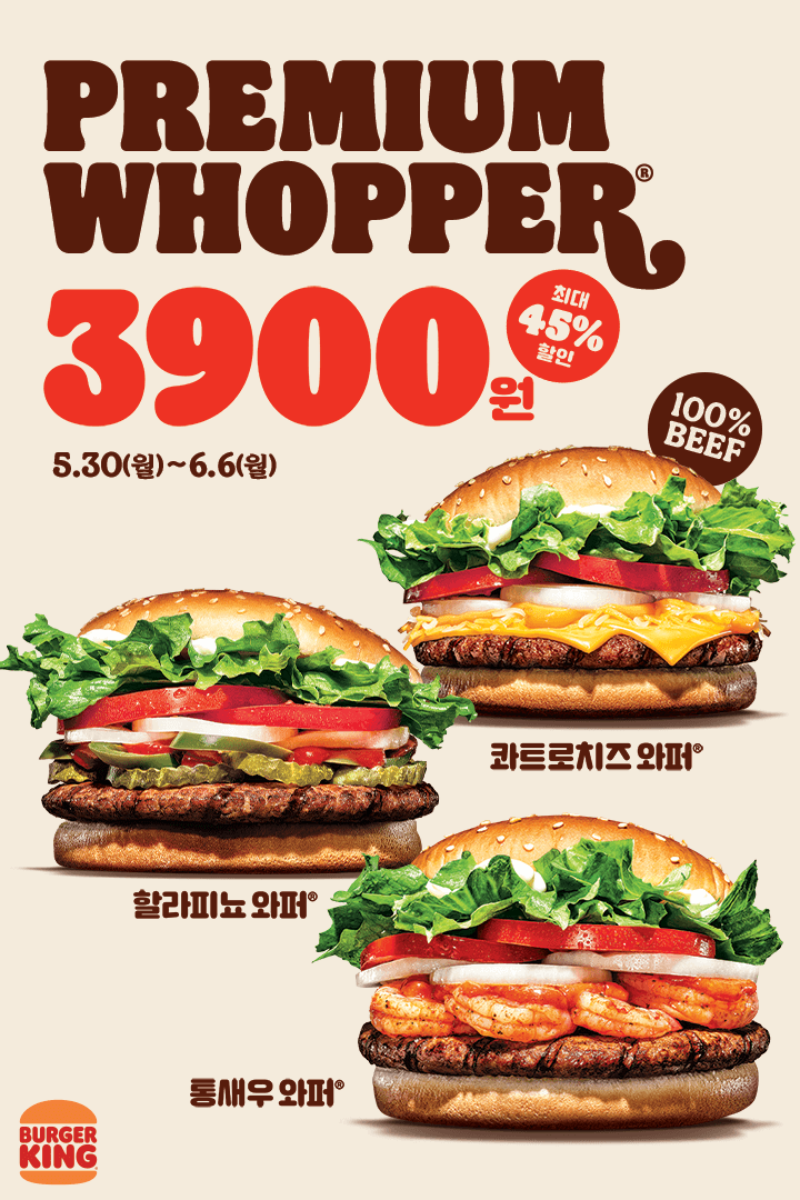버거킹 프리미엄 와퍼 최대 45% 할인 버거킹 프리미엄 와퍼 최대 45% 할인 정보 포스팅입니다. 버거킹 다양한 메뉴를 할인 판매하네요. 할인 메뉴 : 콰트로치즈와퍼, 할라피뇨와퍼, 통새우와퍼 이벤트 기간 : 2022년 5월 30일 ~ 2022년 6월 6일 핫딜/식품&생활 2022.05.30