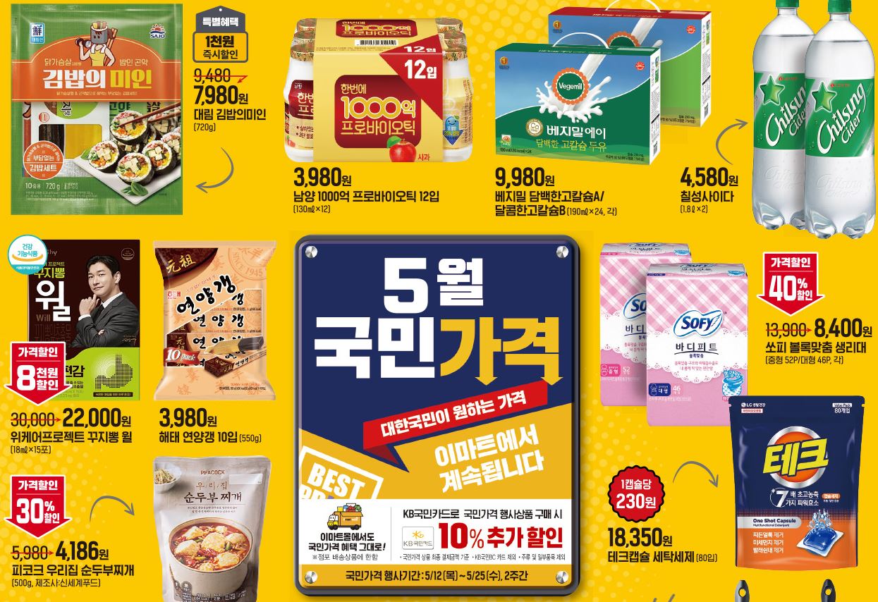 이마트 5월 국민가격 이벤트 이마트 5월 국민가격 이벤트 정보 포스팅입니다. 이마트 할인 이벤트를 진행하네요. 할인 품목 : 과일, 생활용품, 가공식품 등 국민카드 결제시 10% 추가할인 이마트 5월 국민가격 이벤트 정보 [링크] 핫딜/식품&생활 2022.05.12