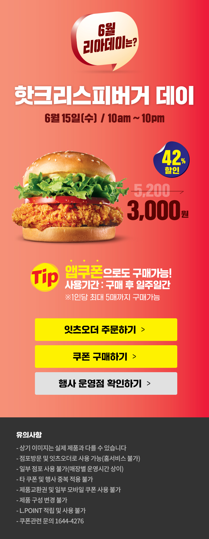 롯데리아 리아데이 이벤트 롯데리아 리아데이 이벤트 정보 포스팅입니다. 롯데리아 핫크리스피버거 할인 판매를 진행하네요. 정상가 5200원 / 할인가 3000원 롯데리아 리아데이 이벤트 정보 [링크] 핫딜/식품&생활 2022.06.15