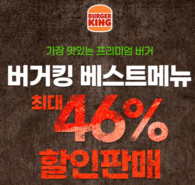 버거킹 베스트메뉴 최대 46% 할인 버거킹 베스트메뉴 최대 46% 할인 정보 포스팅입니다. 버거킹 다양한 메뉴를 할인 판매하네요. 할인 품목 : 불고기와퍼 주니어세트 등 버거킹 베스트메뉴 최대 46% 할인 정보 [링크] 핫딜/식품&생활 2022.06.08