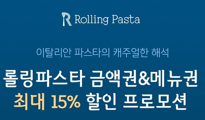롤링파스타 최대 15% 할인 롤링파스타 최대 15% 할인 정보 포스팅입니다. 롤링파스타 다양한 메뉴를 할인 판매하네요. 할인 메뉴 : 금액권, 빼쉐 파스타 등 롤링파스타 최대 15% 할인 정보 [링크] 핫딜/식품&생활 2022.06.03