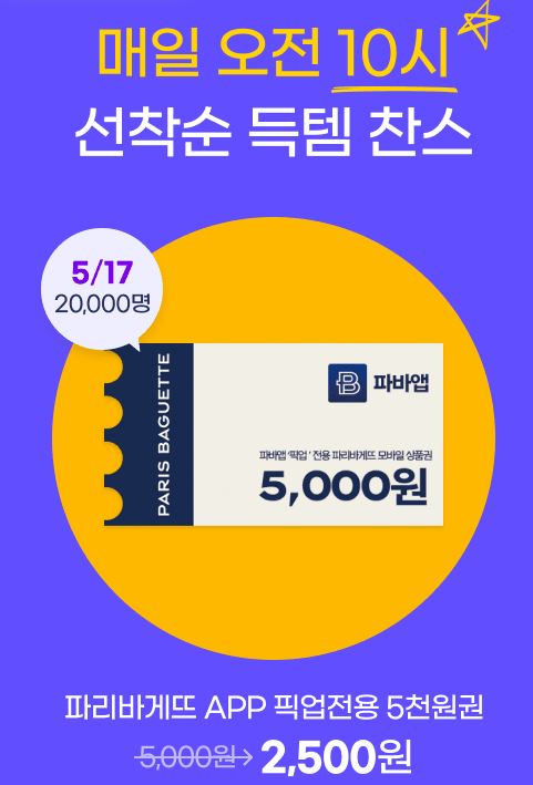 파리바게트 모바일 상품권 50% 할인 파리바게트 모바일 상품권 50% 할인 정보 포스팅입니다. 파리바게트 모바일 상품권을 할인 판매하네요. 정가 5000원 / 할인가 2500원 선착순 2만명 G마켓 앱에서 구입 가능 파리바게트 모바일 상품권 50% 할인 정보 [링크] 핫딜/식품&생활 2022.05.17