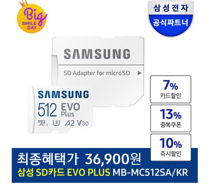 삼성 마이크로SD카드 EVO PLUS 512GB 할인 삼성 마이크로SD카드 EVO PLUS 512GB 할인 정보 포스팅입니다. 삼성 마이크로SD카드 EVO PLUS 512GB을 할인 판매하네요. 할인가 36900원 무료배송 삼성 마이크로SD카드 EVO PLUS 512GB 할인 정보 [링크] 핫딜/PC&가전 2024.11.04