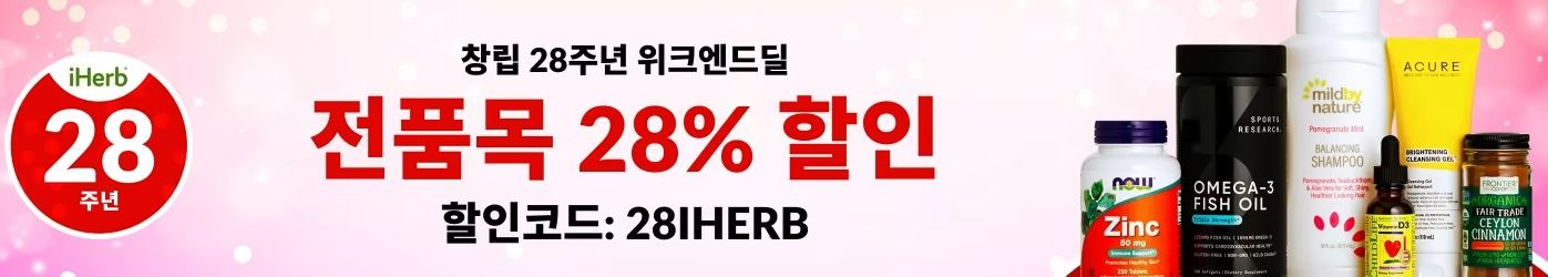 아이허브 전품목 28% 할인 아이허브 전품목 28% 할인 정보 포스팅입니다. 아이허브 창립 28주년 할인 이벤트를 진행하네요. 할인코드 : 28IHERB 페이코 5만원 이상 결제 시 추가 할인 이벤트 기간 : 2024년 9월 17일 오전 2시까지 아이허브 전품목 28% 할인 정보 [링크] 핫딜/식품&생활 2024.09.15
