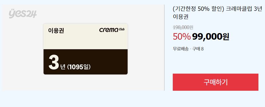 예스24 크레마클럽 3년이용권 50% 할인 예스24 크레마클럽 3년이용권 50% 할인 정보 포스팅입니다. 예스24 크레마클럽 3년이용권을 할인 판매하네요. 할인가 99000원 예스24 크레마클럽 3년이용권 50% 할인 정보 [링크] 핫딜/식품&생활 2024.09.12