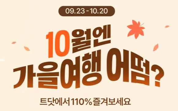 트립닷컴 10월엔 가을여행 이벤트 트립닷컴 10월엔 가을여행 이벤트 정보 포스팅입니다. 트립닷컴 다양한 할인 이벤트를 진행하네요. 할인 품목 : 항공권, 숙박권 등 이벤트 기간 : 2024년 10월 20일까지 트립닷컴 10월엔 가을여행 이벤트 정보 [링크] 핫딜/식품&생활 2024.09.24