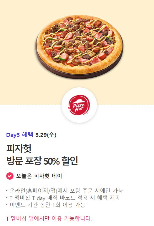 T멤버십 T DAY 이벤트 T멤버십 T DAY 이벤트 정보 포스팅입니다. T멤버십 회원 대상으로 다양한 이벤트를 진행하네요. 할인 브랜드 : 피자헛, 뚜레쥬르, 공차 이벤트 기간 : 2023년 3월 29일 T 맴버십 앱에서 이벤트 이용 가능 핫딜/식품&생활 2023.03.29
