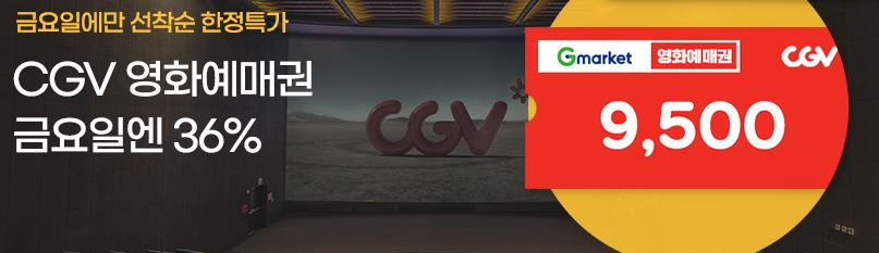 CGV 영화예매권 36% 할인 CGV 영화예매권 36% 할인 정보 포스팅입니다. CGV 영화예매권을 할인 판매하네요. 할인가 9500원 G마켓 [링크] 옥션 [링크] 핫딜/식품&생활 2023.03.10