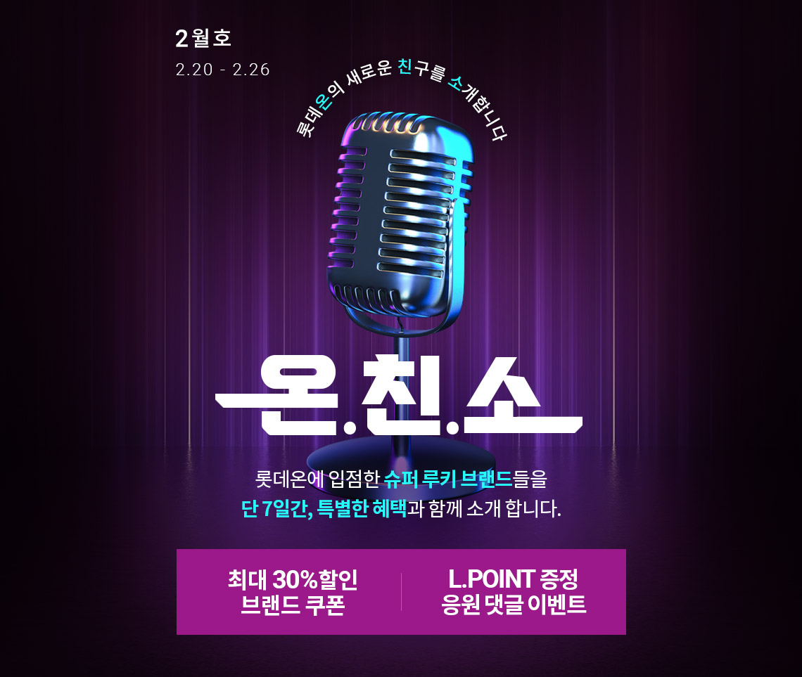 롯데온 온친소 최대 30% 쿠폰 할인 롯데온 온친소 최대 30% 쿠폰 할인 정보 포스팅입니다. 롯데온 사이트에서 할인 이벤트를 진행하네요. 할인 품목 : 의류, 영양제, 화장품 등 이벤트 기간 : 2023년 2월 20일 ~ 2023년 2월 26일 롯데온 온친소 최대 30% 쿠폰 할인 정보 [링크] 핫딜/패션&스포츠 2023.02.20