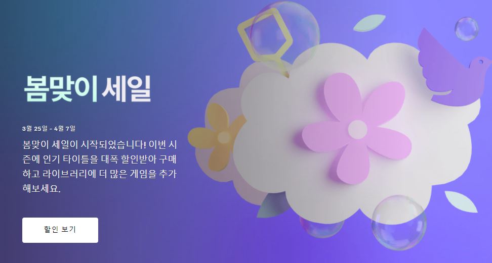 에픽게임즈 봄맞이 세일 에픽게임즈 봄맞이 세일 정보 포스팅입니다. 에픽게임즈 사이트에서 할인 이벤트를 진행하네요. 할인 게임 : 사이버펑크, 데스루프, 레데리2 등 이벤트 기간 : 2022년 3월 25일 ~ 2022년 4월 7일 에픽게임즈 봄맞이 세일 정보 [링크] 핫딜/PC&가전 2022.03.25
