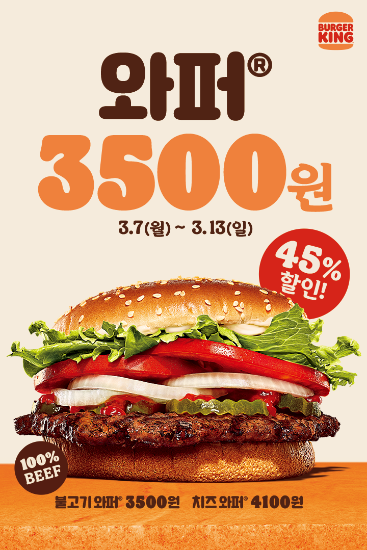 버거킹 할인 이벤트 버거킹 할인 이벤트 정보 포스팅입니다. 버거킹 다양한 메뉴를 할인 판매하네요. 할인 메뉴 : 와퍼, 불고기와퍼, 치즈와퍼 이벤트 기간 : 2022년 3월 7일 ~ 2022년 3월 13일 핫딜/식품&생활 2022.03.07