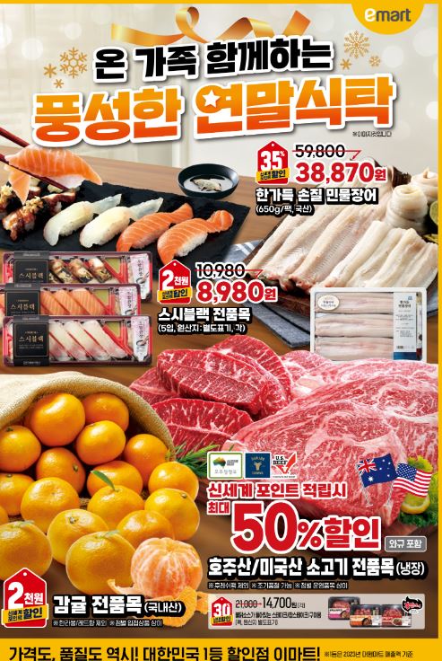 이마트 할인 이벤트 이마트 할인 이벤트 정보 포스팅입니다. 이마트 다양한 제품을 할인 판매하네요. 할인 품목 : 민물장어, 과일, 소고기 등 이마트 할인 이벤트 정보 [링크] 핫딜/식품&생활 2024.12.27