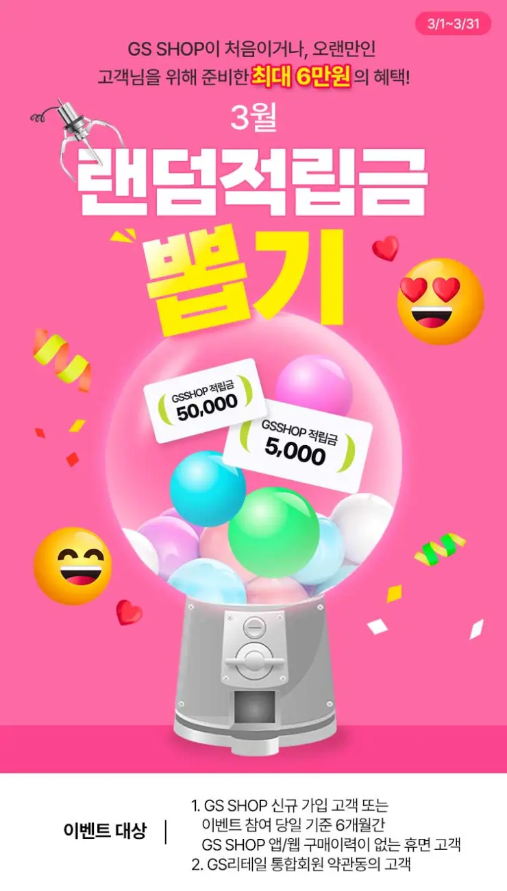 GS샵 6개월간 미구매 고객 랜덤적립금 뽑기 이벤트 GS샵 6개월간 미구매 고객 랜덤적립금 뽑기 이벤트 정보 포스팅입니다. GS샵 6개월간 미구매 고객 및 신규가입 고객 대상 랜덤적립금 뽑기 이벤트를 진행하네요. 최소 5000원 최대 5만원 이벤트 기간 : 2024년 3월 31일까지 GS샵 6개월간 미구매 고객 랜덤적립금 뽑기 이벤트 정보 [링크] 핫딜/식품&생활 2024.03.07