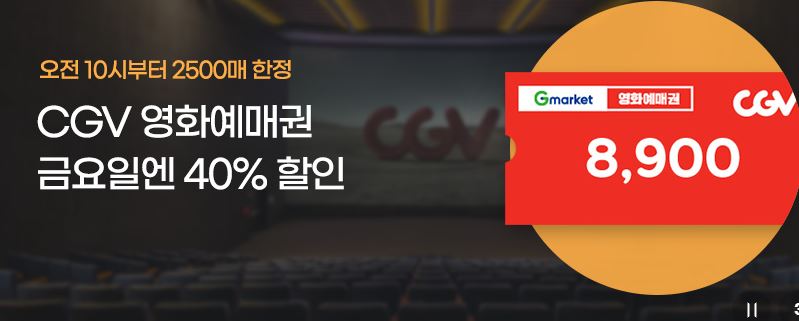 CGV 영화예매권 40% 할인 CGV 영화예매권 40% 할인 정보 포스팅입니다. CGV 영화예매권을 할인 판매하네요. 정가 15000원 / 할인가 8900원 오전 10시 한정 판매 G마켓 [링크] 옥션 [링크] 핫딜/식품&생활 2022.07.29