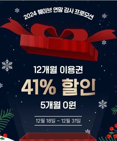 웨이브 12개월 이용권 41% 할인 웨이브 12개월 이용권 41% 할인 정보 포스팅입니다. 웨이브 12개월 이용권 41% 할인 판매하네요. 베이직 55500원 스탠다드 77000원 프리미엄 99000원 이벤트 기간 : 2024년 12월 31일까지 웨이브 12개월 이용권 41% 할인 정보 [링크] 핫딜/식품&생활 2024.12.27
