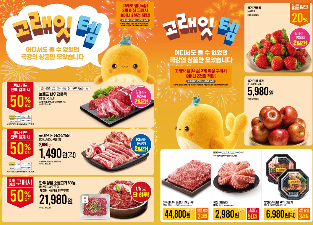 이마트 할인 이벤트 이마트 할인 이벤트 정보 포스팅입니다. 이마트 다양한 제품을 할인 판매하네요. 할인 품목 : 과일, 축산물, 가공식품 등 이벤트 기간 : 2025년 1월 1일 ~ 2025년 1월 5일 이마트 할인 이벤트 정보 [링크] 핫딜/식품&생활 2025.01.01