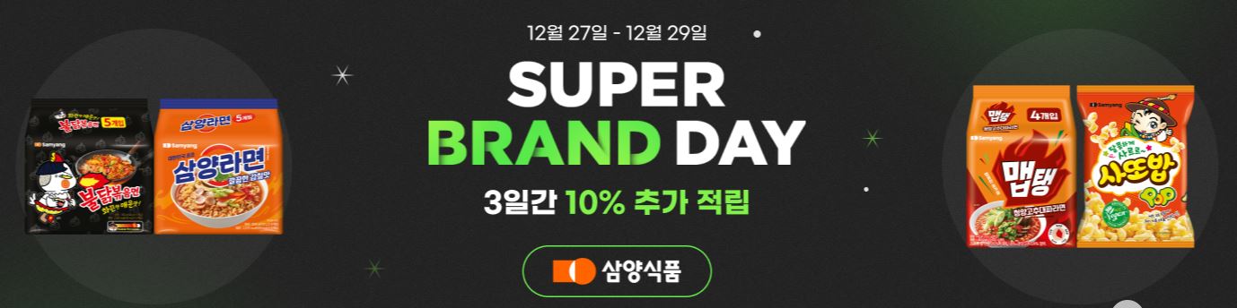 삼양 슈퍼 브랜드 데이 삼양 슈퍼 브랜드 데이 정보 포스팅입니다. 삼양 다양한 제품을 할인 판매하네요. 할인 품목 : 불닭볶음면, 삼양라면 등 이벤트 기간 : 2024년 12월 27일 ~ 2024년 12월 29일 삼양 슈퍼 브랜드 데이 정보 [링크] 핫딜/식품&생활 2024.12.27